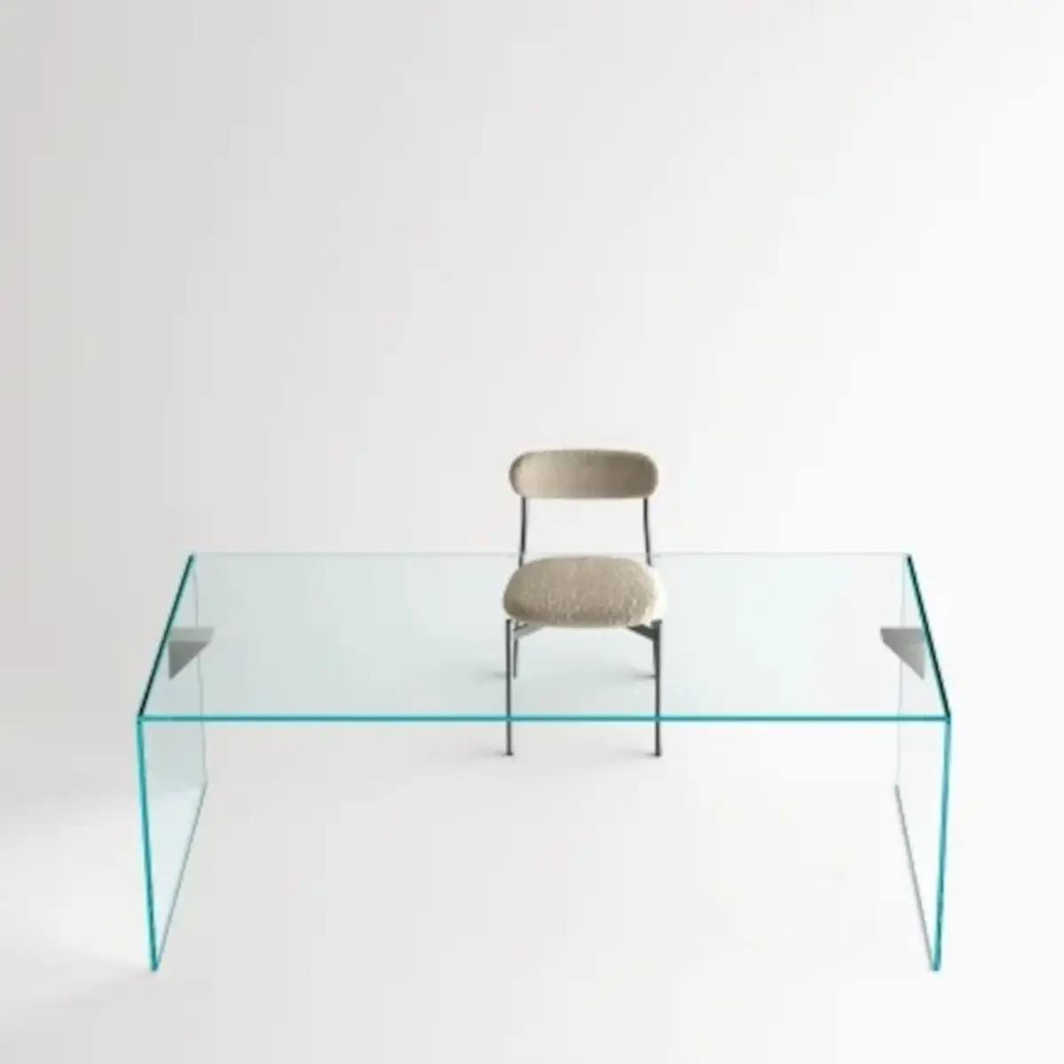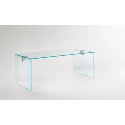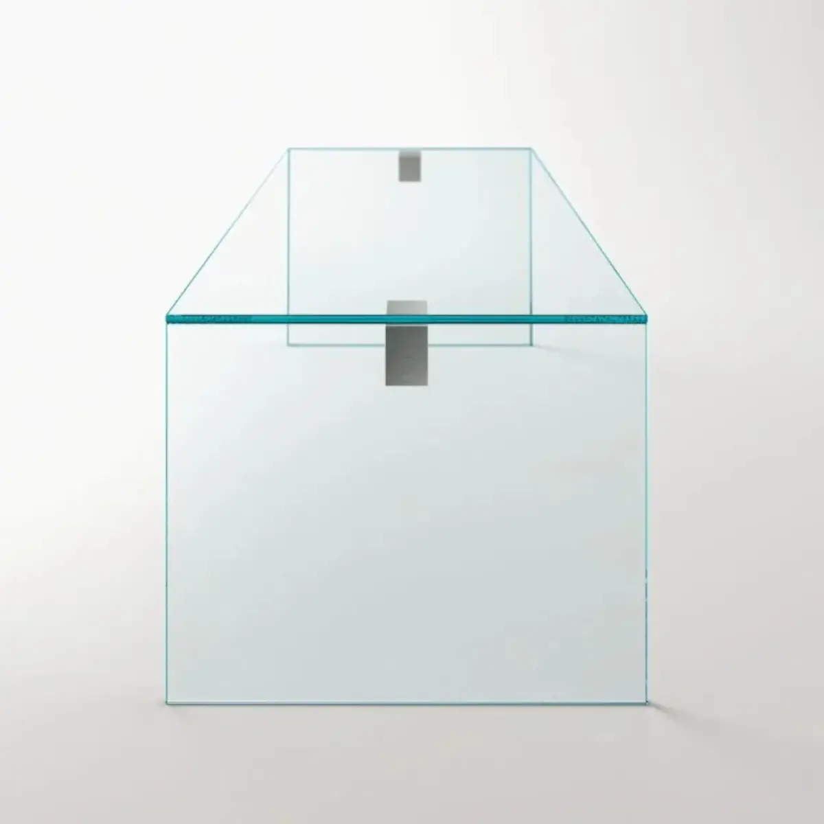 Scrivania in vetro temperato da 15 mm smontabile, con supporti di fissaggio in acciaio inossidabile. Ordinabile con dimensione a richiesta.