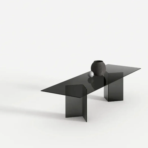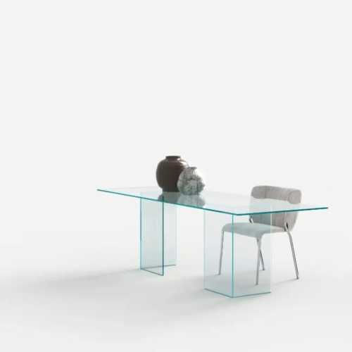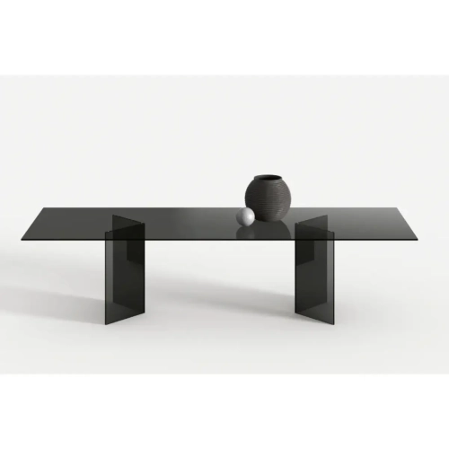 Il tavolo di design in vetro Bacco è composto da un piano disponibile in versione trasparente, extrachiara o fumè, con struttura formata da due sostegni in vetro speculari che appoggiano a terra. Le sue linee pulite sono particolarmente adatte ad arredamenti minimal, perché non appesantiscono l’ambiente. La trasparenza rende la stanza più luminosa e crea un effetto più ampio.
