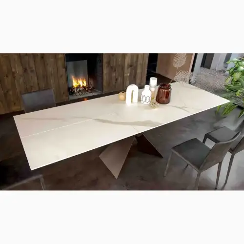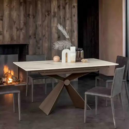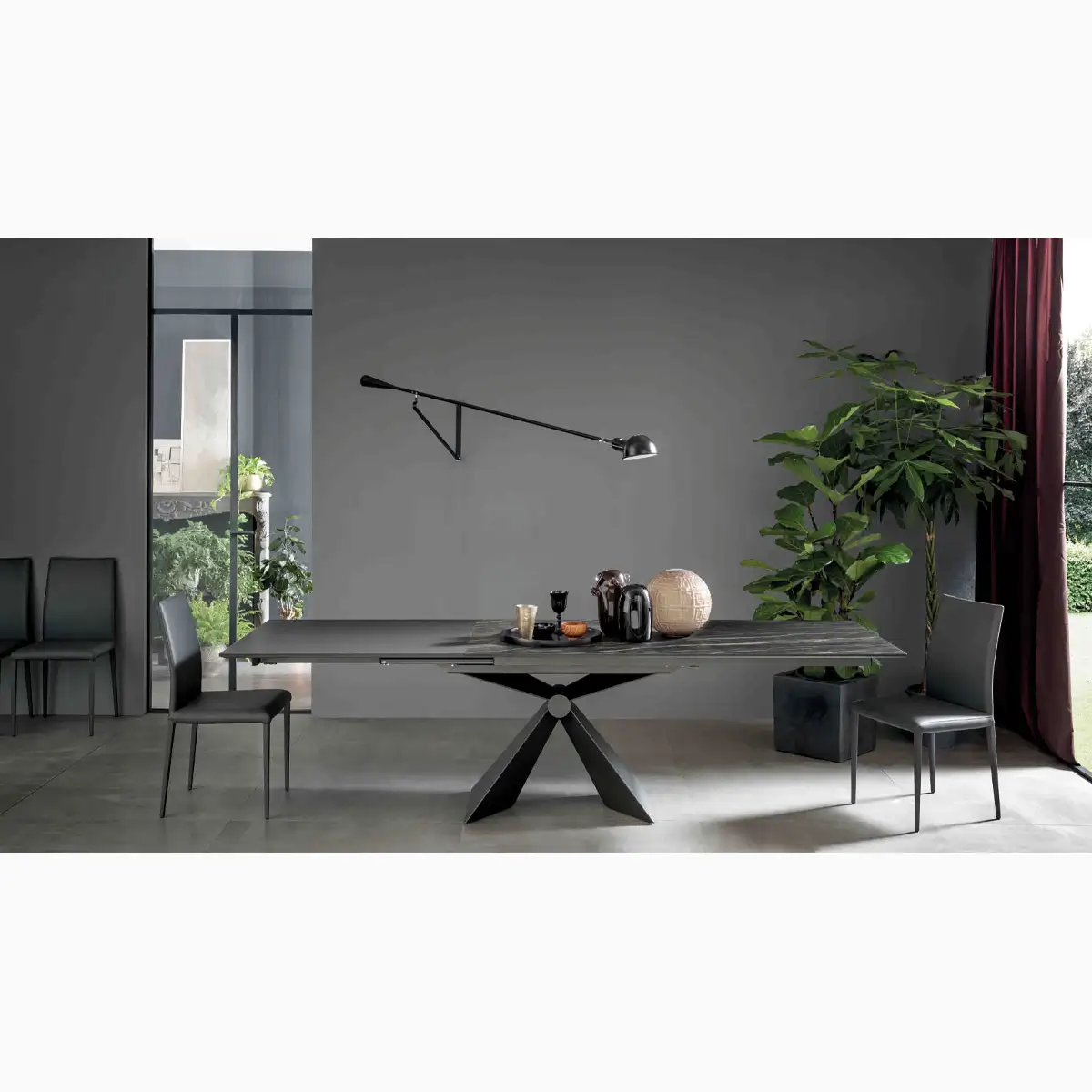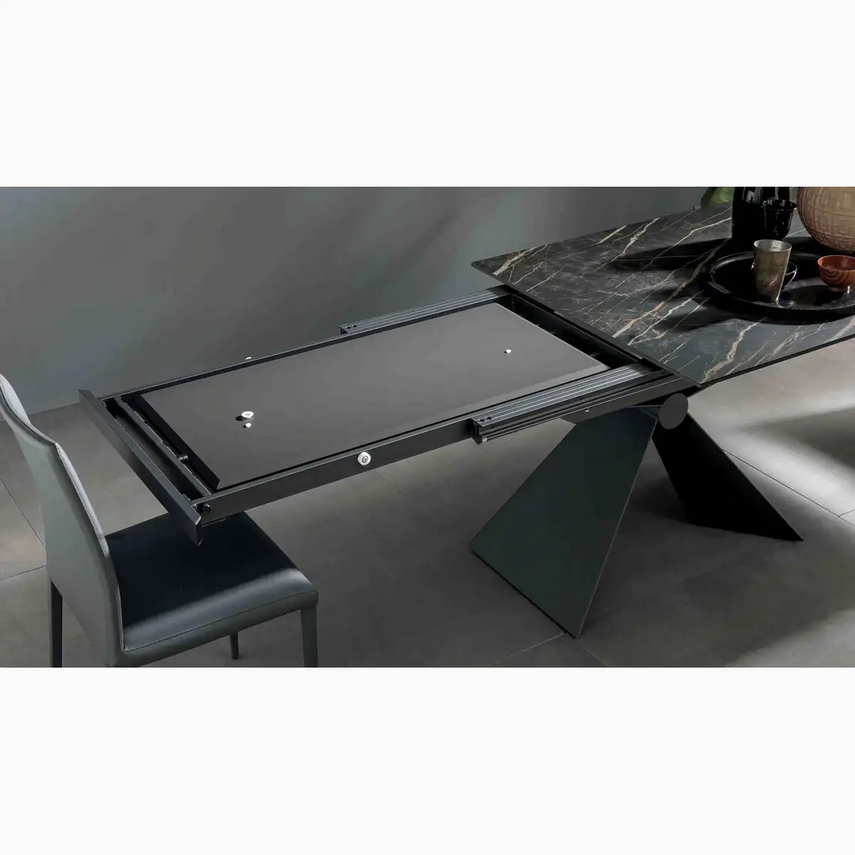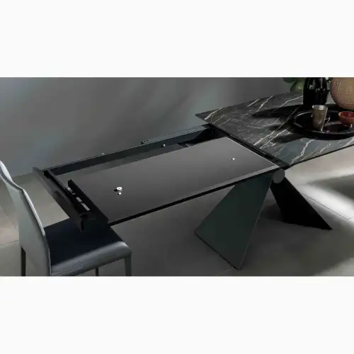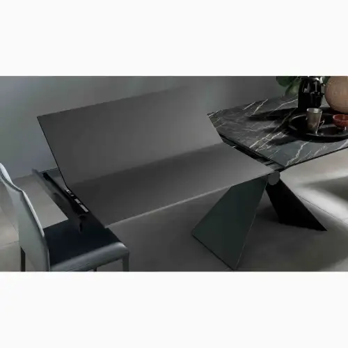 Il sostegno centrale in metallo caratterizza il tavolo allungabile Sintesi, garantendone la stabilità durante il movimento di apertura. Il vano interno contiene l’allunga ripiegata, pronta per aggiungere spazio alla convivialità.